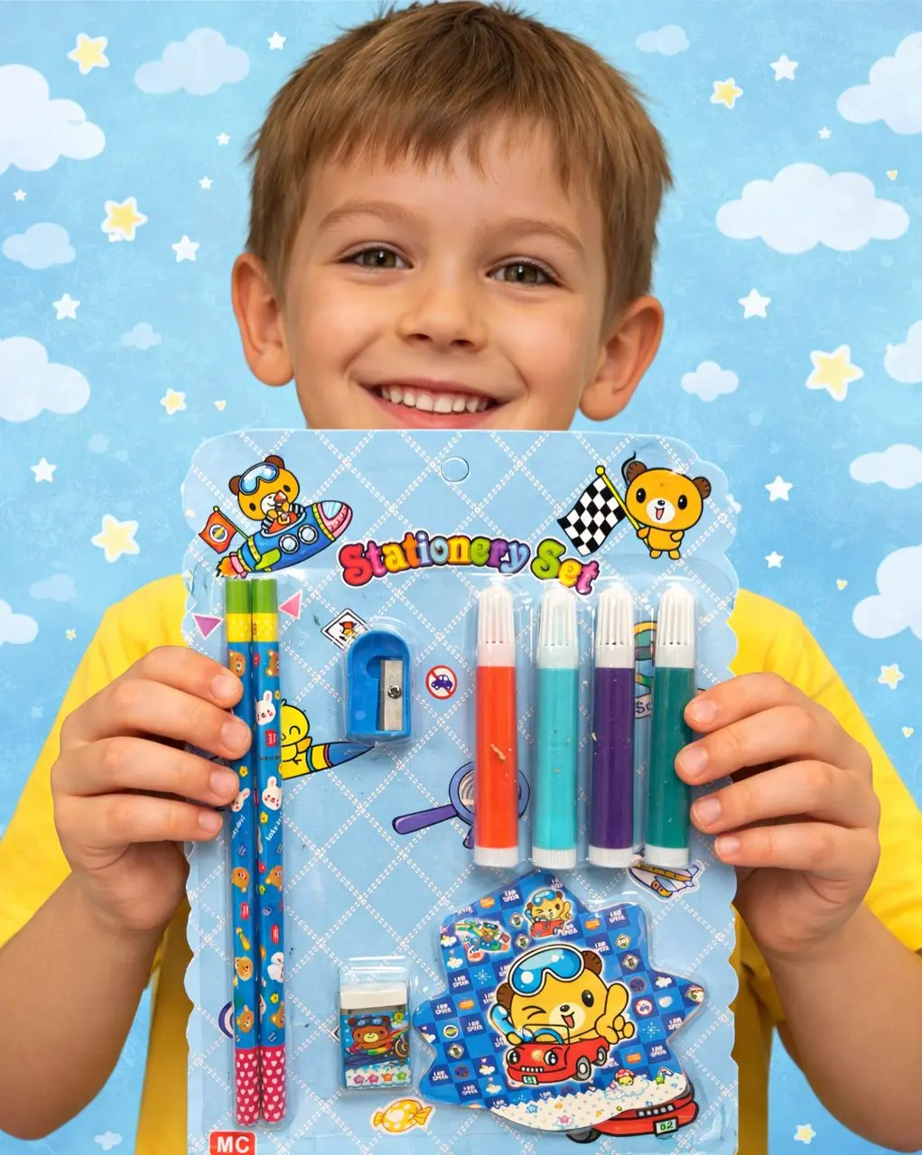 Set de útiles infantiles ideal para el colegio, el jardín o actividades en casa. Diseñado para acompañar el aprendizaje y la creatividad de niños y niñas, con materiales resistentes y un formato práctico para el uso diario.